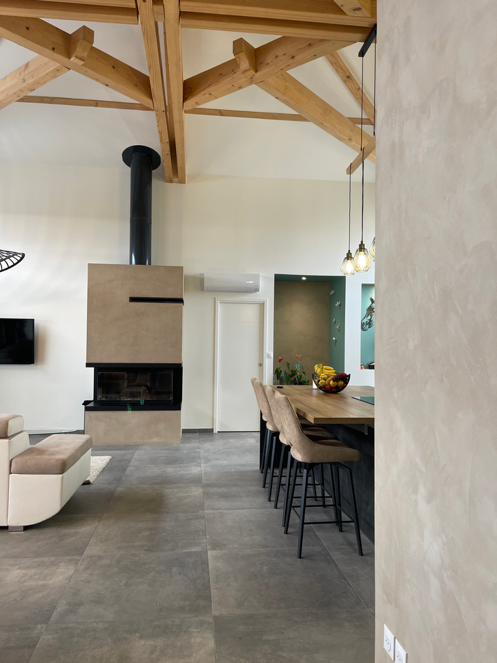 Aménagement d’un espace de vie ouvert mêlant convivialité, fonctionnalité et harmonie des volumes. Un lieu pensé pour partager et se retrouver.